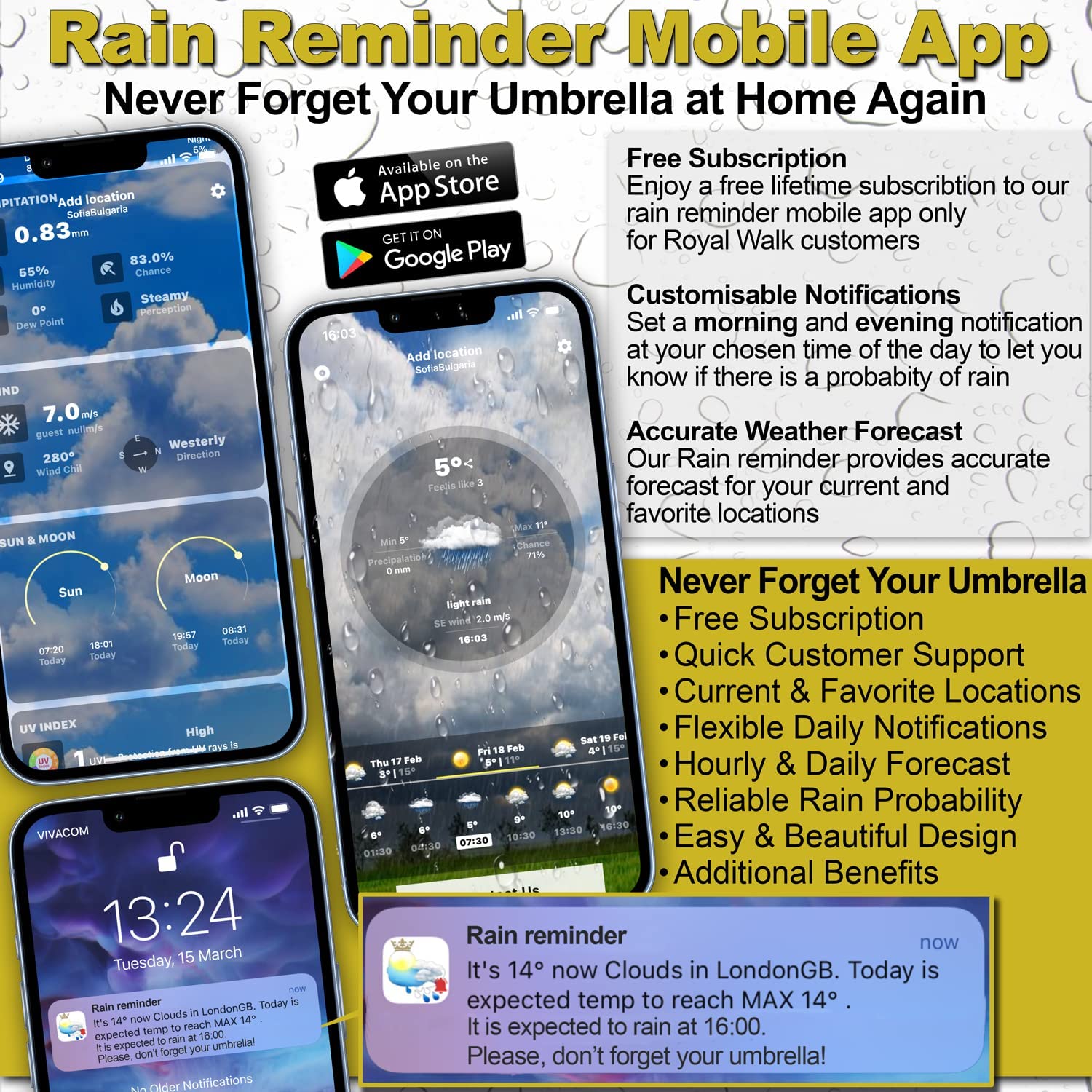 ?? RAIN REMINDER APP included – ALWAYS BE INFORMED and NEVER GET CAUGHT IN THE RAIN AGAIN – our one of a kind distinguished type of weather app gives you the opportunity to set receiving notifications when there is a possibility to rain and it will gently remind you to take your umbrella with you.