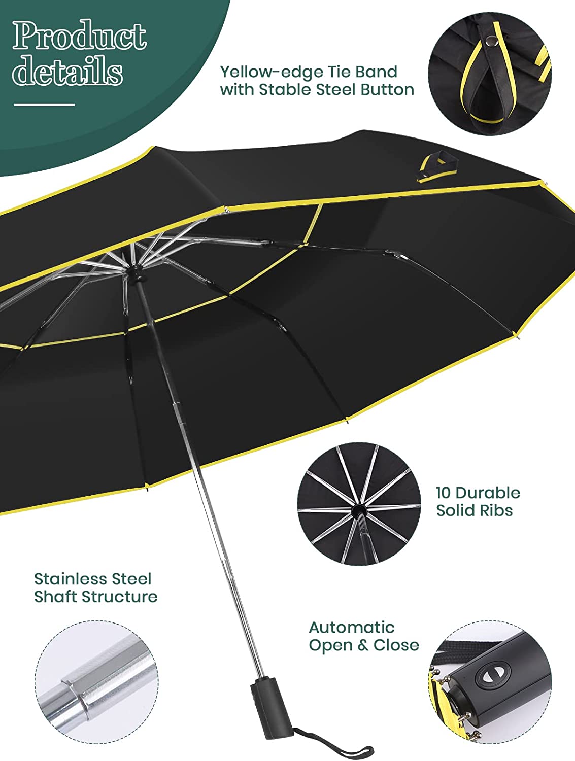 10 Ribs Wind-Resistant Solid Umbrella: The flexible structure of the folding umbrellas made of fiberglass and high quality stainless steel will not break under the effect of strong winds. The umbrella is also equipped with a vented double canopy. The frame can easily bounces back unbroken to its normal shape if the umbrella canopy flip inside out in strong large wind.