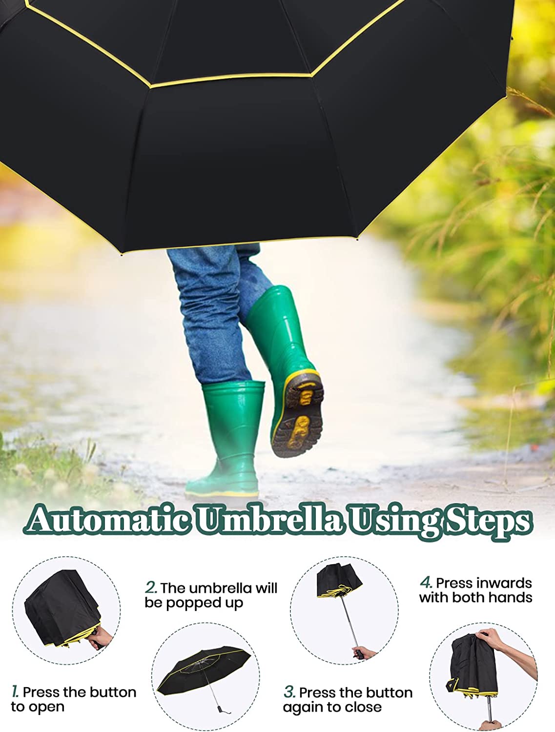 Auto Open/Close Non-Slip Comfort Handle: The auto open/close function allows for easy one-handed operation. Just push the button once to automatically open and press again to instantly fold the canopy closed in one second. Comfortably handle design for a good non-slip grip for windy rainy days with embedded push-button mechanism prevent your hand from being pinched with wrist strap for easy carrying when going outside.