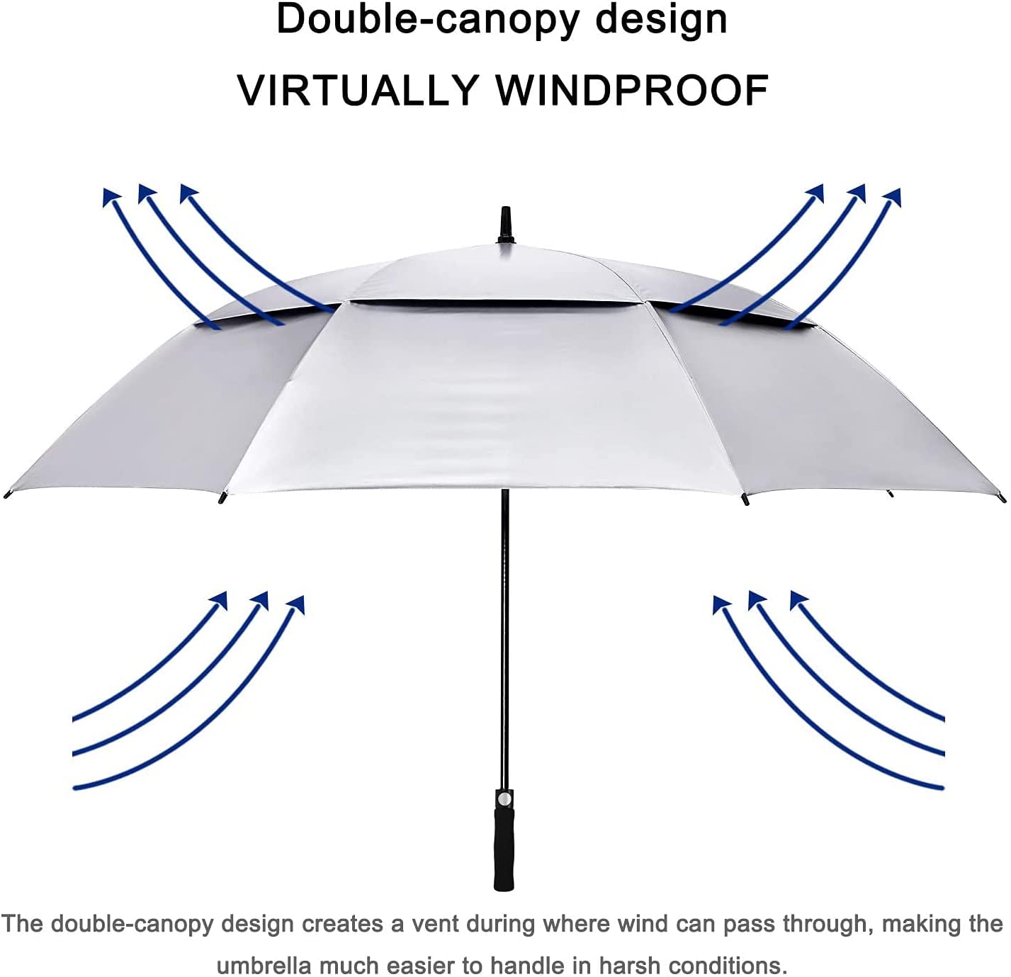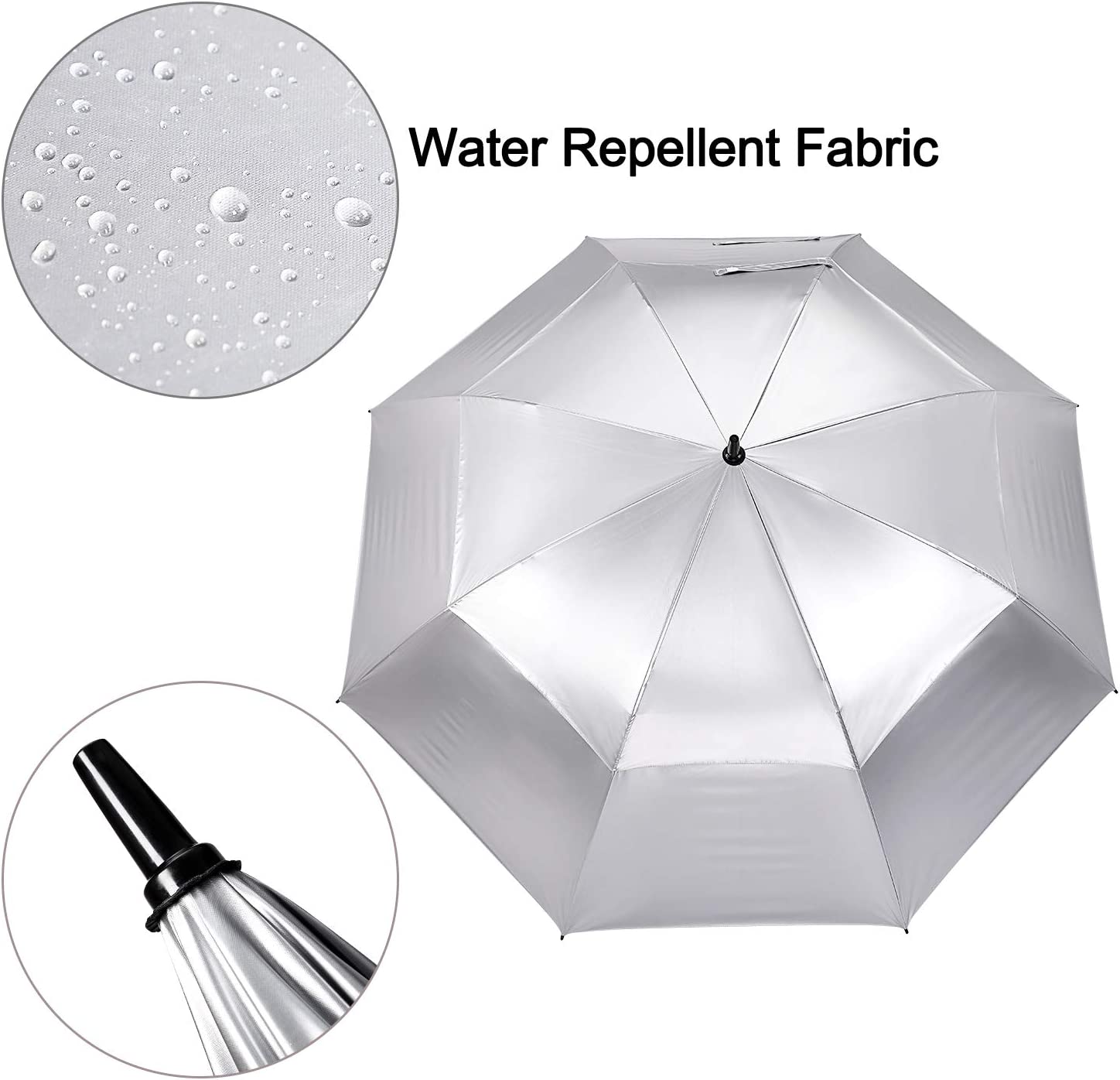 【Pinchless Auto Open】The silver oversized golf umbrella has a 68-inch arc and 59-inch diameter canopy. It is big to hold 4 people standing tightly underneath. Simply press the button on the EVA handle. Auto opens in one second. Ensures no delay and gives timely protection from sun or rain.