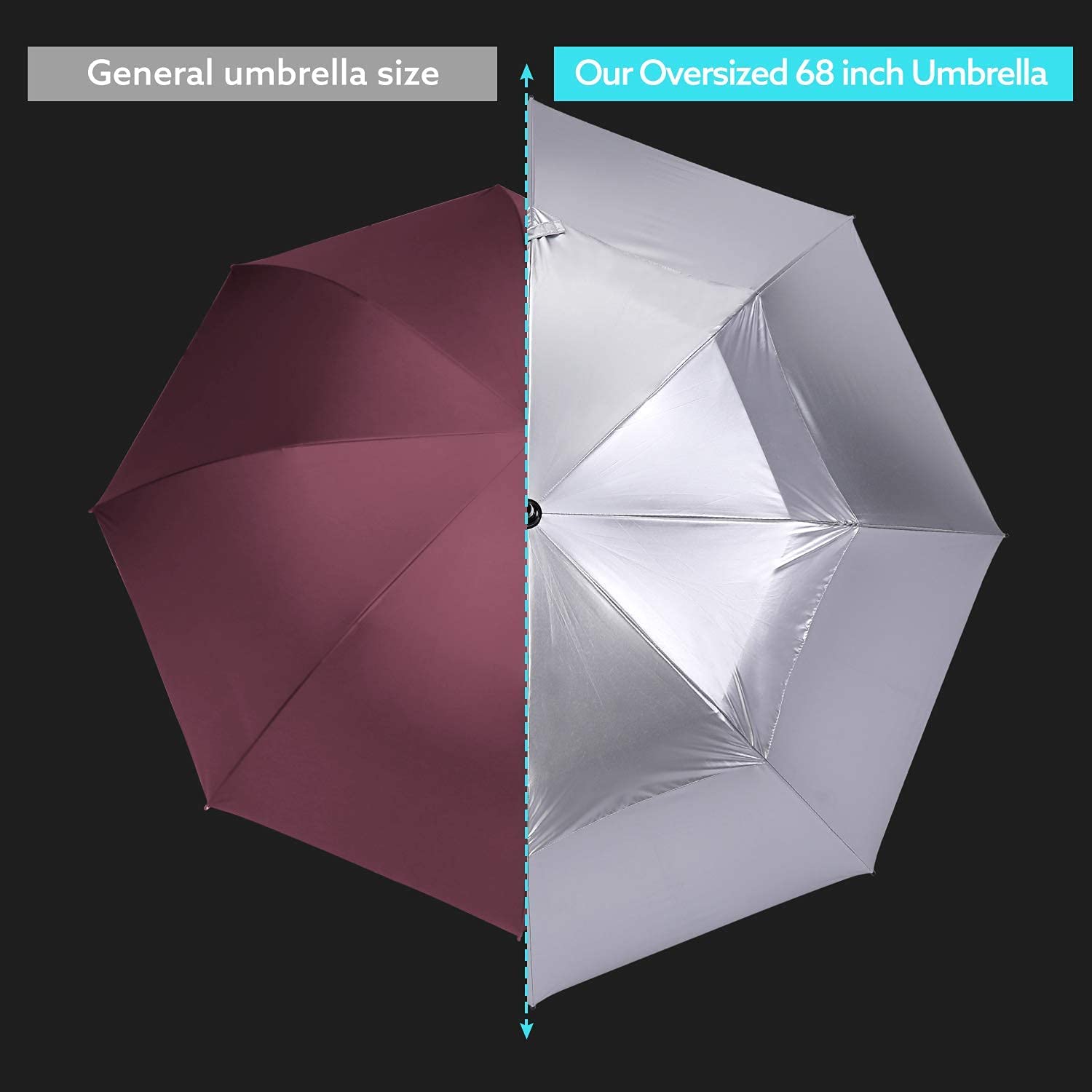 【UV Protection Umbrella UPF 50+】Custom umbrella 68 inch UV golf umbrellas are made of 210T high-density pongee cloth interior and silver coating fabric exterior. The UPF 50+ rating helps block out 99% of UVA and UVB Rays. Protecting you from aging and wrinkles from the sun.