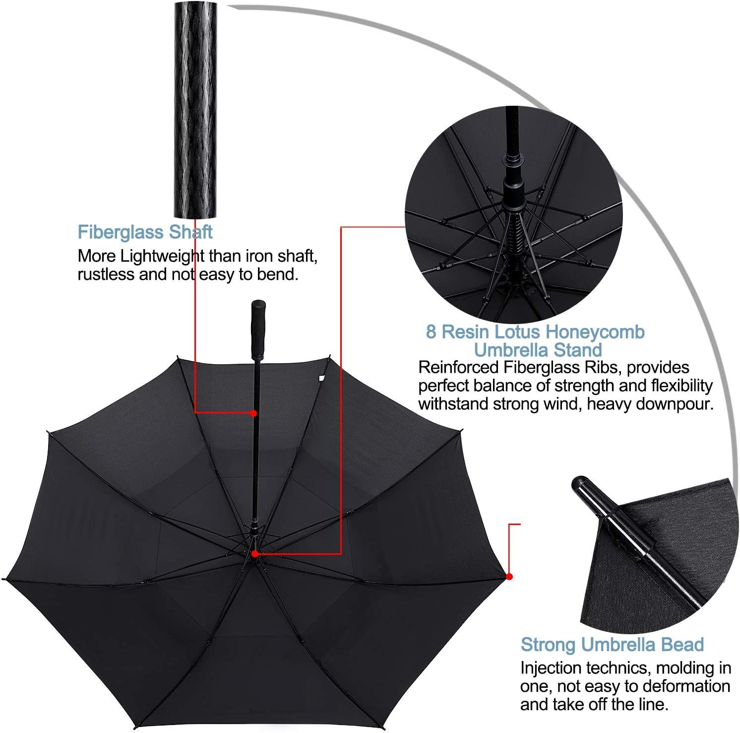 • Durable and stable. This golf umbrella is made of 8 fiberglass ribs and a shaft for greater stability and lightness. The frame is constructed using hardened stainless steel coated in high-quality black resin for long-term uses.