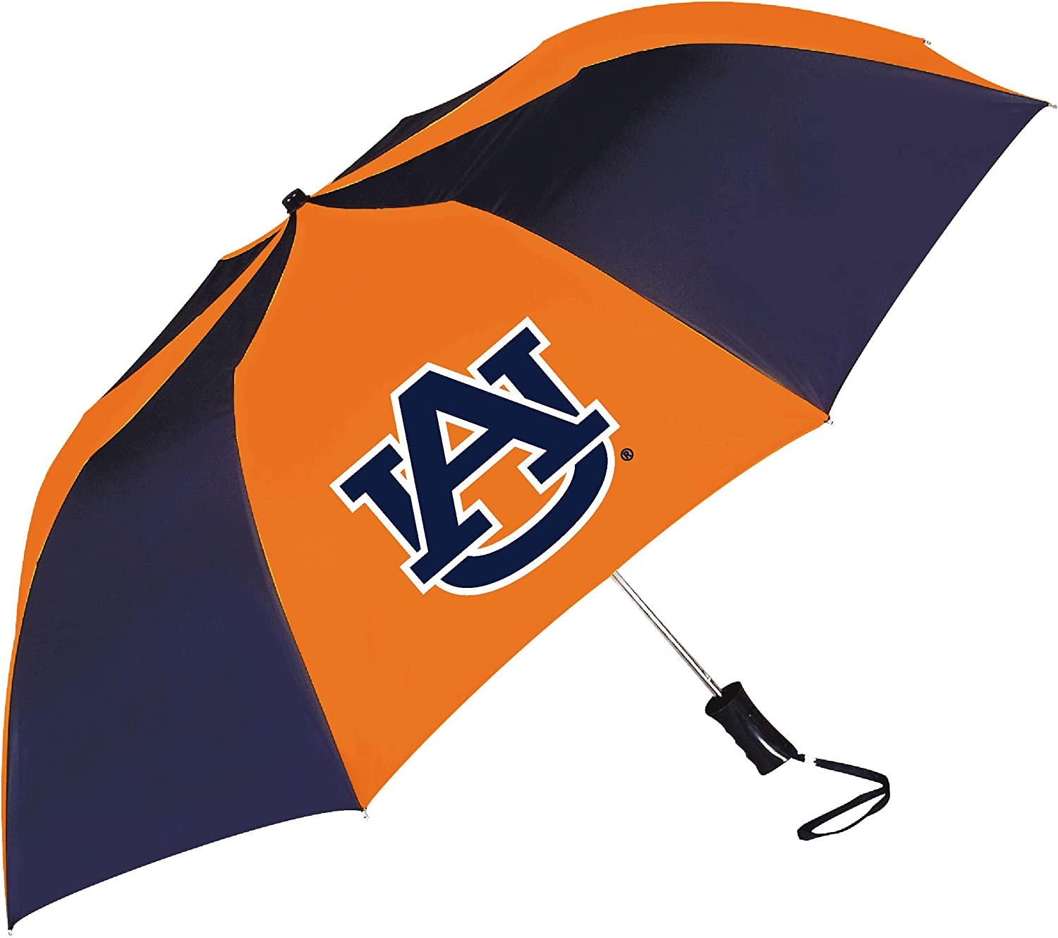 Stay dry and show off your team pride with this Auburn Tigers two-tone umbrella. 48 coverage. Folds easily to 17″ to fit in backpack or briefcase. Strong automatic shaft. Color-coordinated handle with wrist strap.