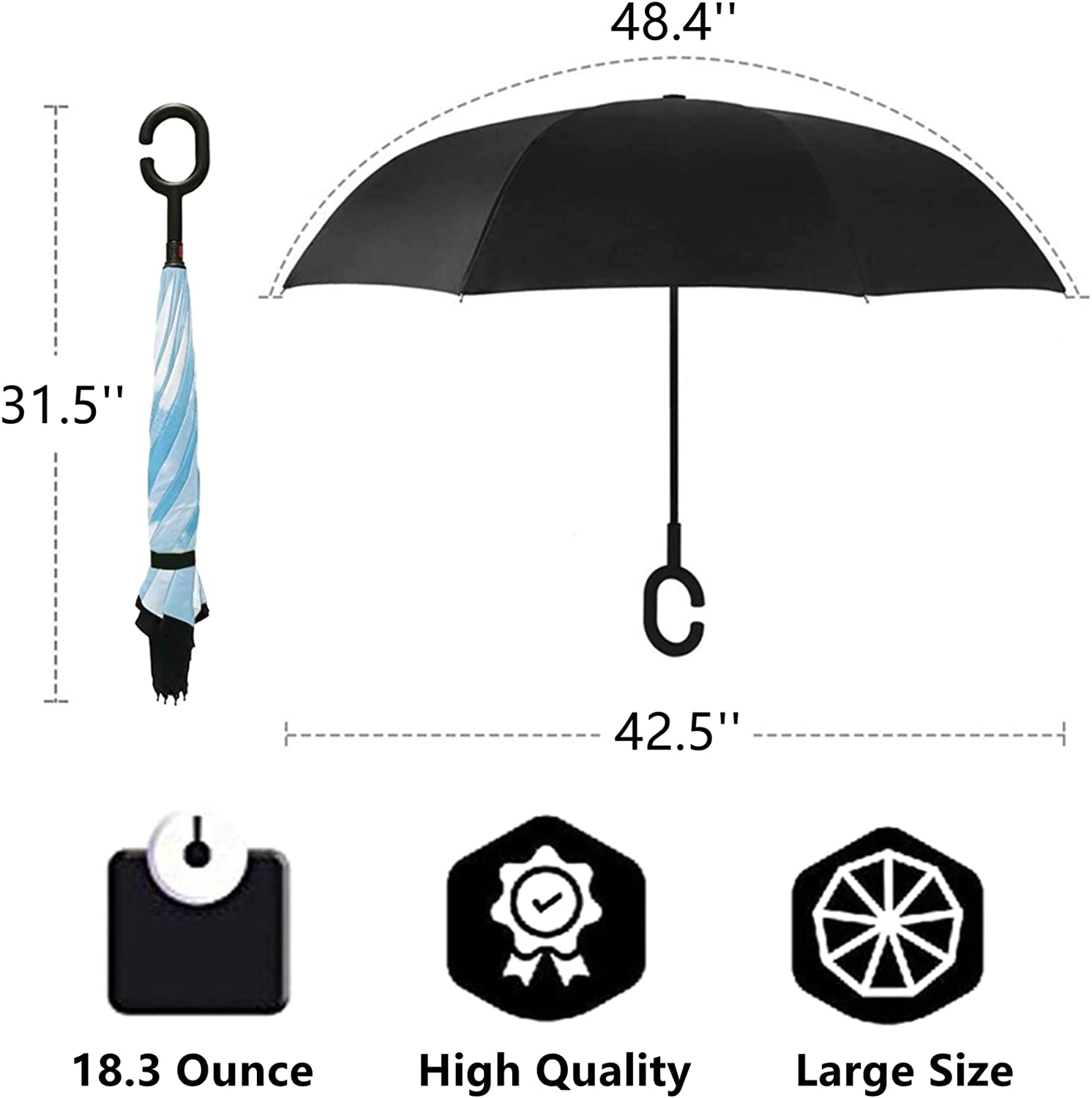 This is an multipurpose reverse umbrella Your pictures logo pattern design name or text designs and so on can be all over printed on the double layer of canopy it’s the veritable customized umbrella; In addition to unique customizable printing it also has a variety of useful functions: Special reverse opening and closing for car Self-standing indoor Hands free c-shaped handle Waterproof & UV protection Large size with double layer cover Windproof Portable and Durable etc.