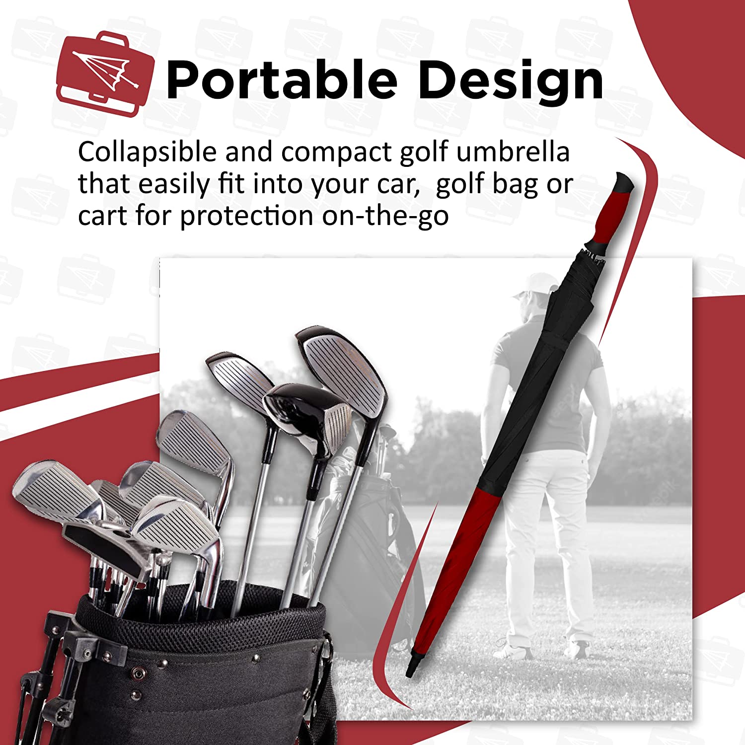 LARGE GOLF UMBRELLA: Heavy duty golf umbrella with 60 inch arc is ideal for rain and sun protection and features a strong windproof fiberglass frame with durable water resistant polyester; this oversized stick umbrella is created to repel even the hardest rainfall and the strongest of winds; umbrella features a double canopy for improved wind resistance and a sure-grip rubberized handle