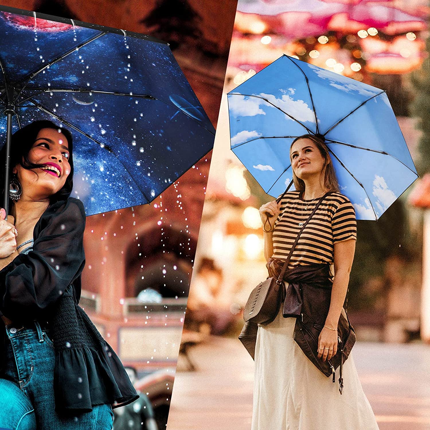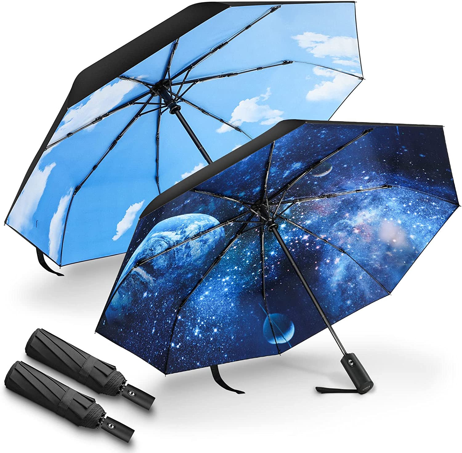 UPGRADED UMBRELLA FABRIC: The travel umbrella adopts multi-layer coating process which has great waterproof and sun protection function. Compact umbrellas have built-in pattern you will meet a good mood when you look up.