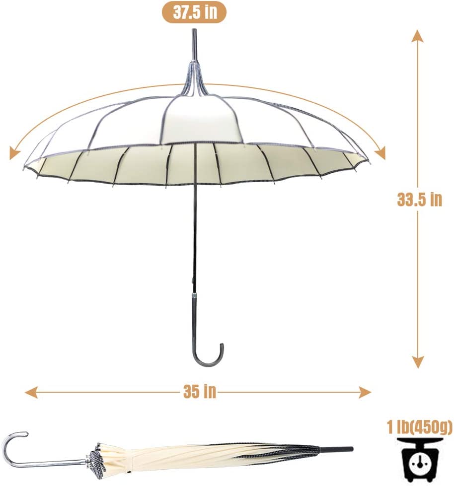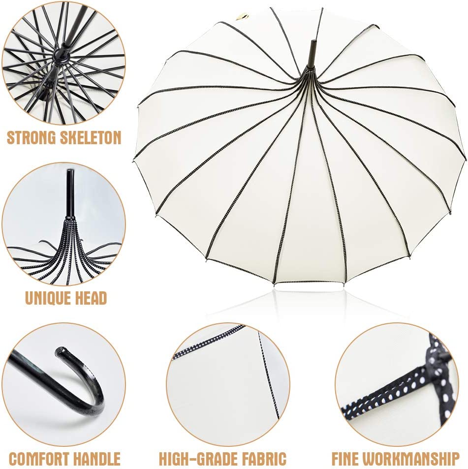?【ELEGANT&CLASSICAL DESIGN】:This classical umbrella features a peaked pagoda shape in old fashionable design with a leather curved handle full of classical elegance and romanticism the best choice for your unique wedding umbrella for bride and groom.