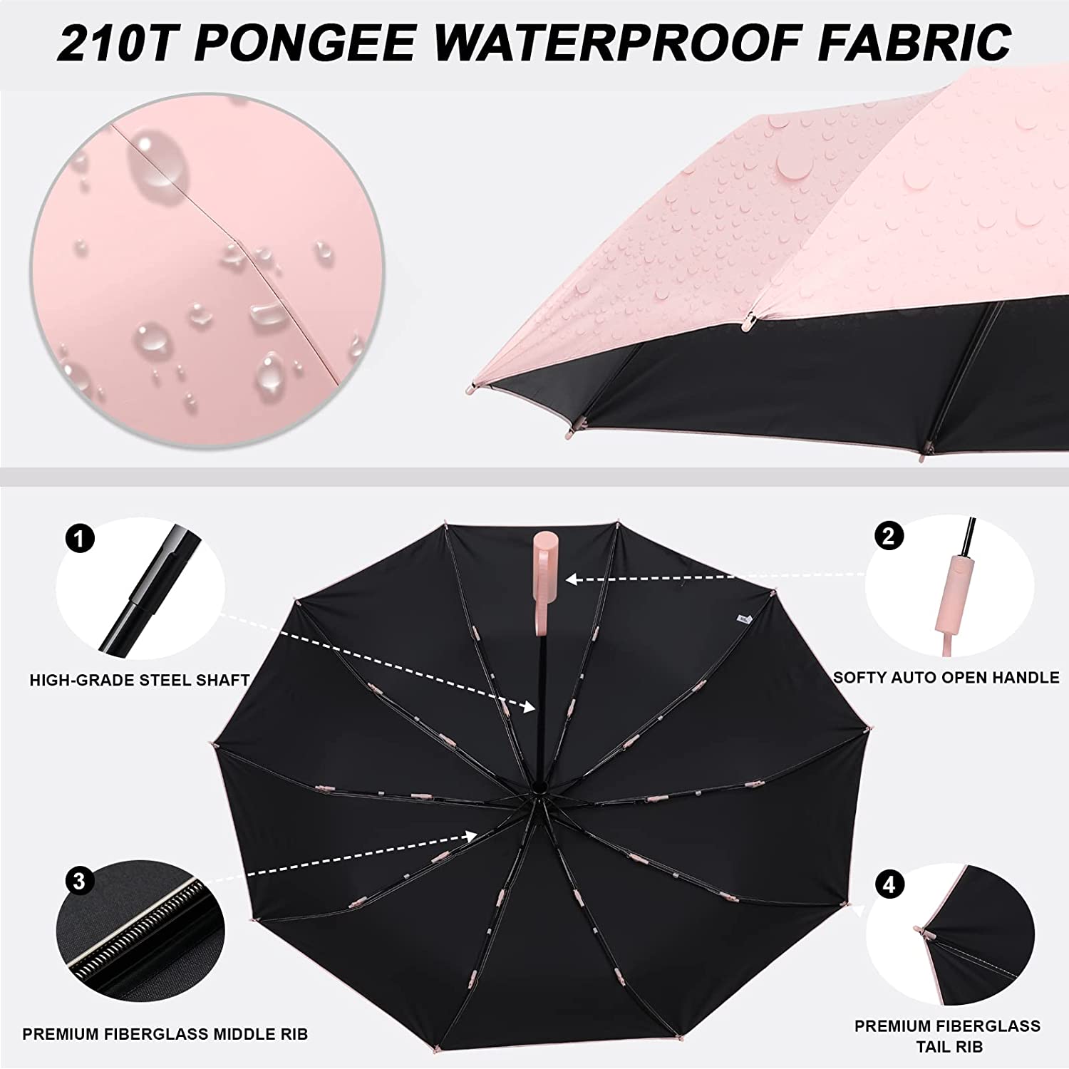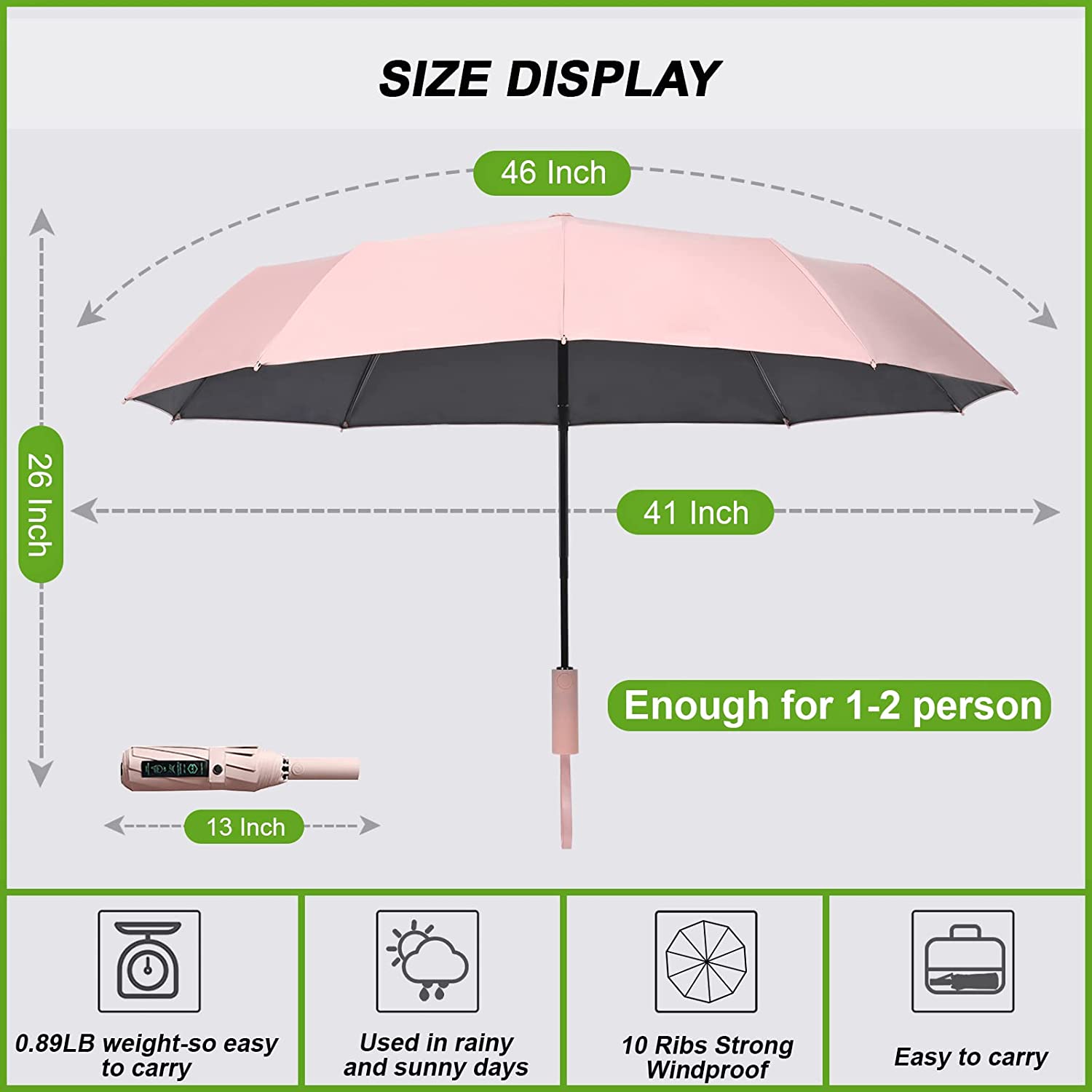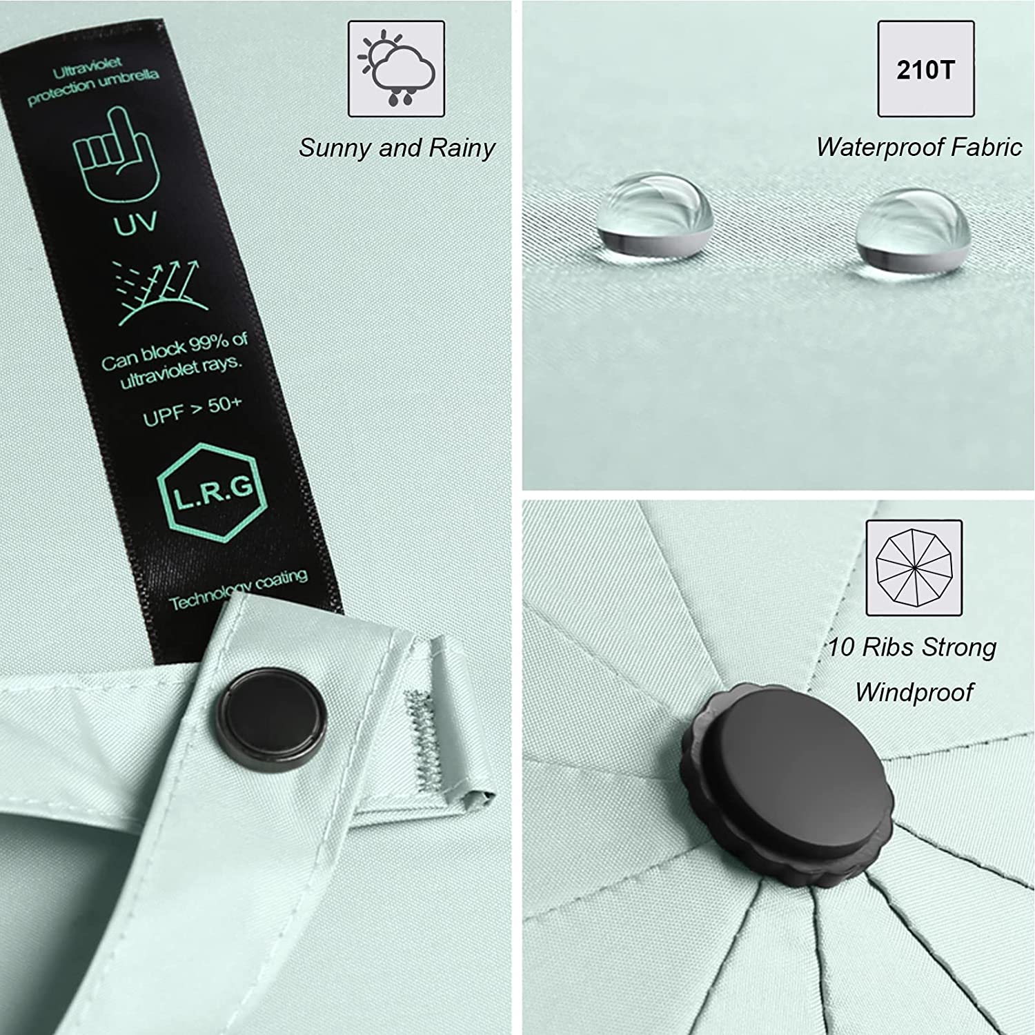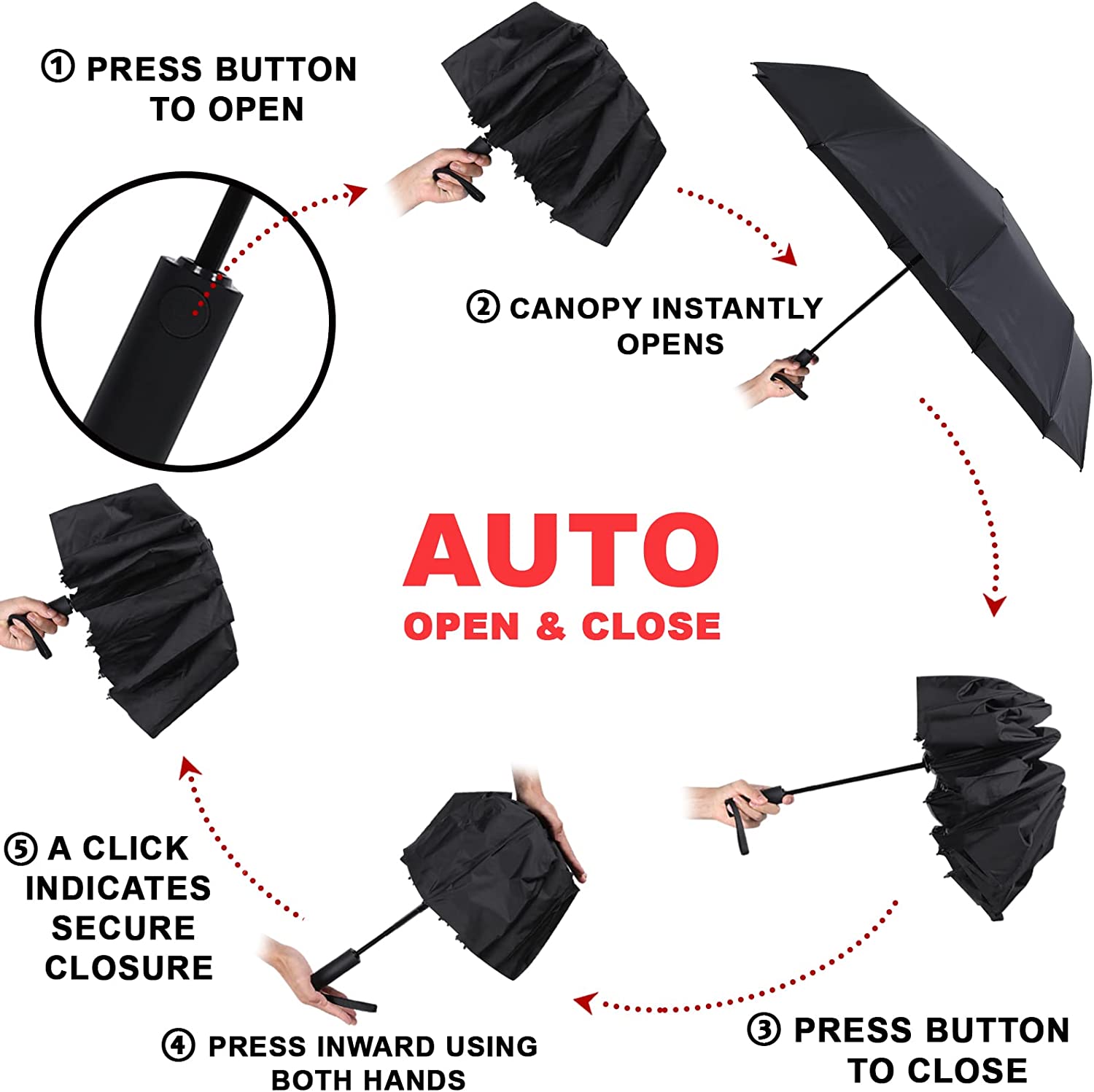 Automatic Open & Close: you can just press a button on the handle to open and close our compact umbrella