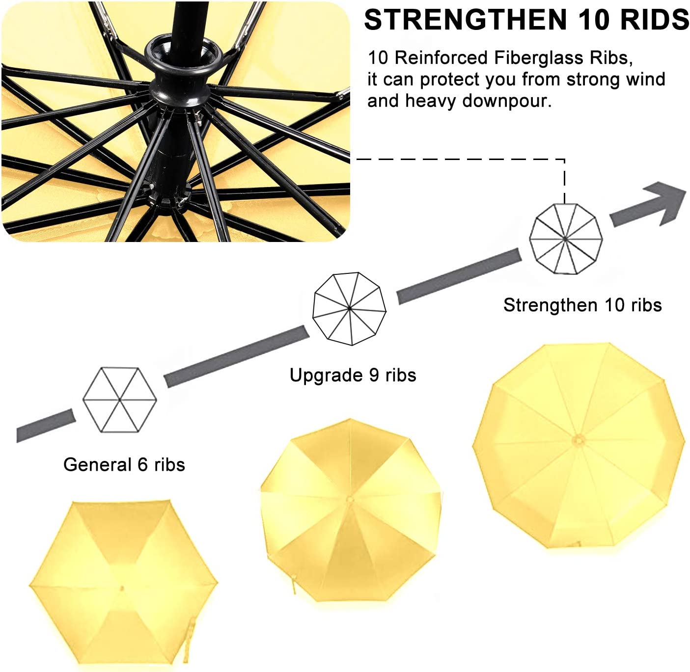 WINDPROOF CONSTRUCTION: The reinforced fiberglass ribs hold the canopy quite taut and do incredibly well on windy days; The main shaft appears to be thicker and more substantial than most; The fabric is very nice and attached very well to the spines; The canopy provides enough coverage so you’ll be well protected from the elements.