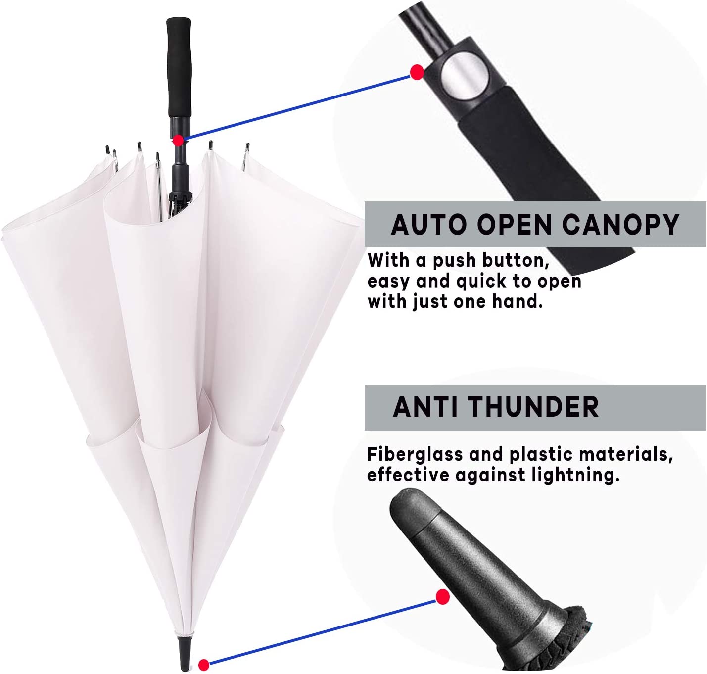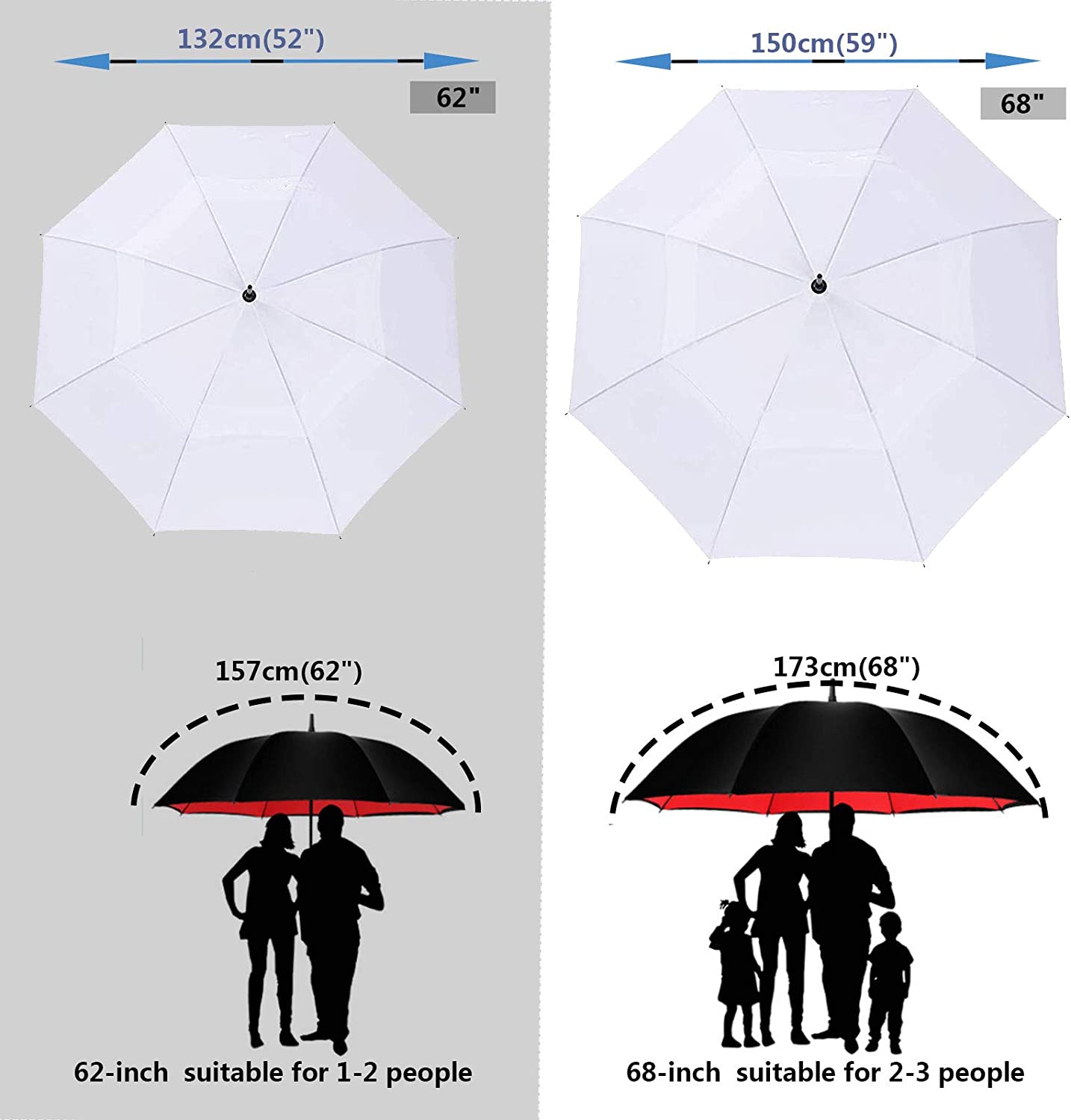 [EXTRA-LARGE ?] The super-comfortable rubberized anti-slip handle with a golf grip-like shape makes this extra larger golf umbrella comfortable easy to grab and fits most umbrella holders perfect for golf sport business travel or daily use. 62 fit 2~3 people(large) 68″ fit 3~4 people(extra huge).