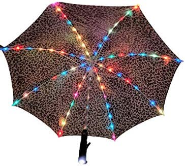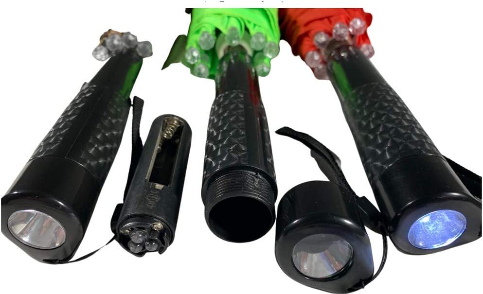ADDITIONAL INFORMATION 23 Fun Umbrella for Rain or Sun 8 Quality LED Strip Lights in the umbrella canopy Operated with 3 step function button on handle 1 LED Umbrella Topper 1- 3 Bulb LED Flashlight in Handle Press bottom of handle to activate flashlight 3 AAA Batteries required- NOT INCLUDED Unscrew Bottom of Handle to Insert Batteries Safe in all weather conditions Non Pinch Closure- Plastic Covered Closure to Prevent Finger Pinch