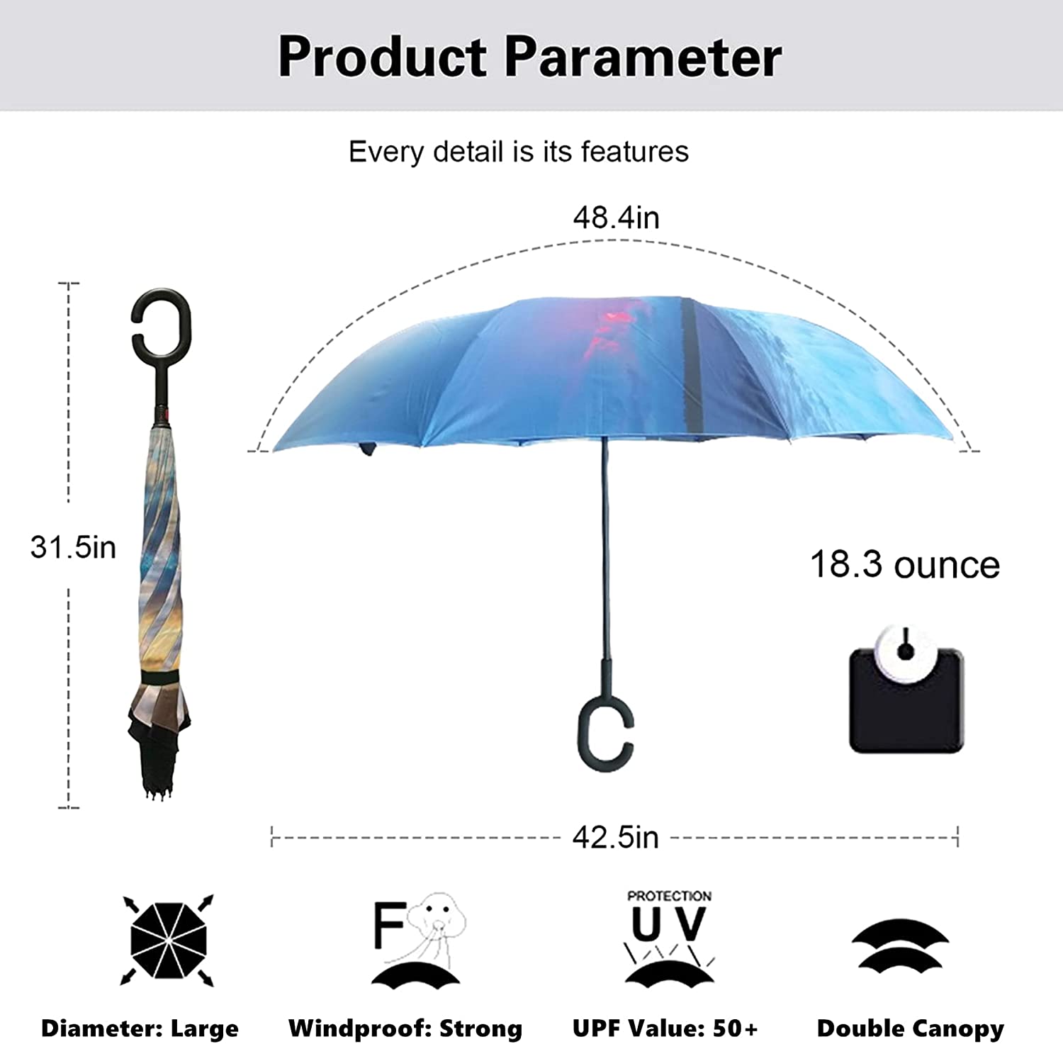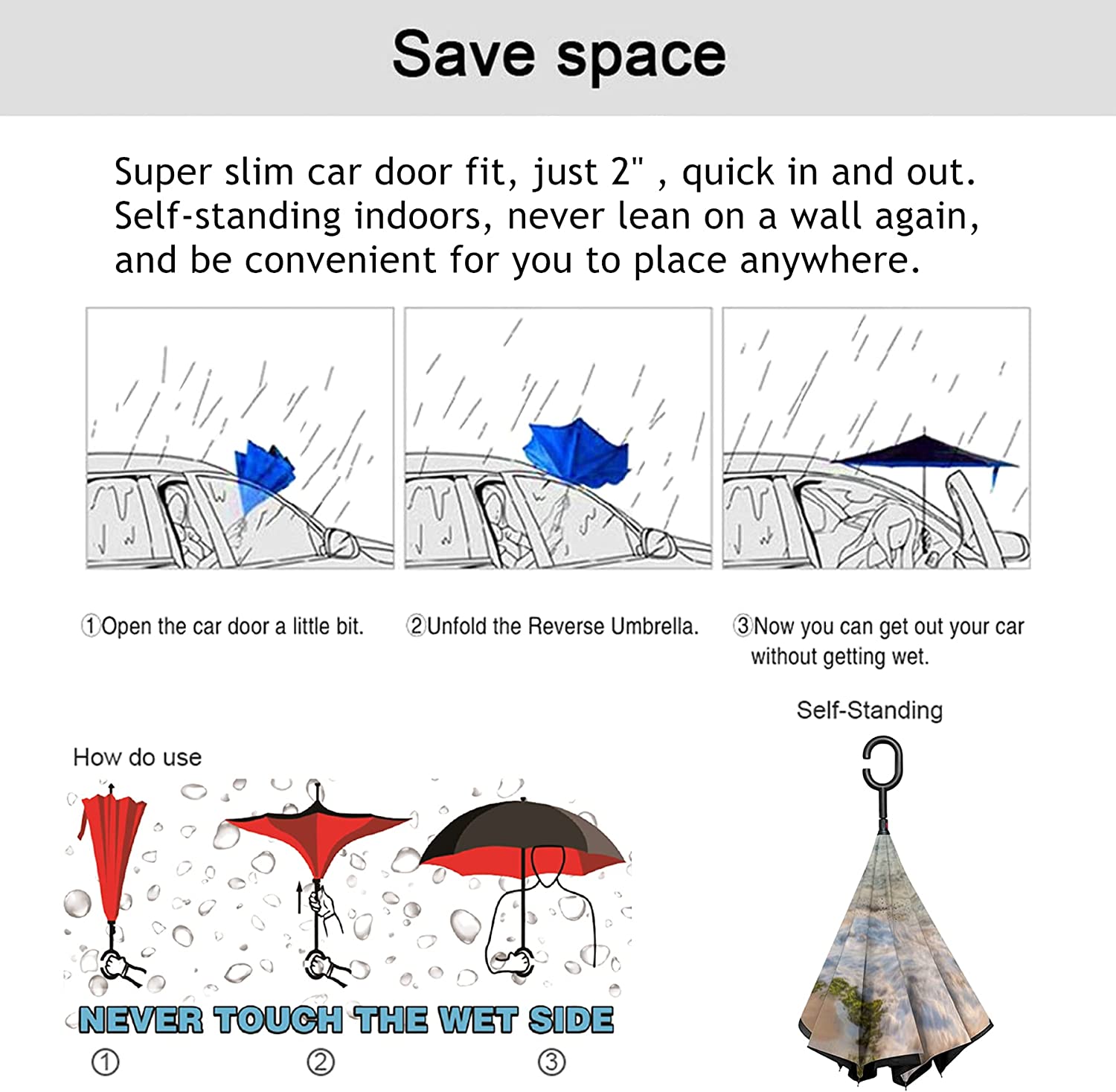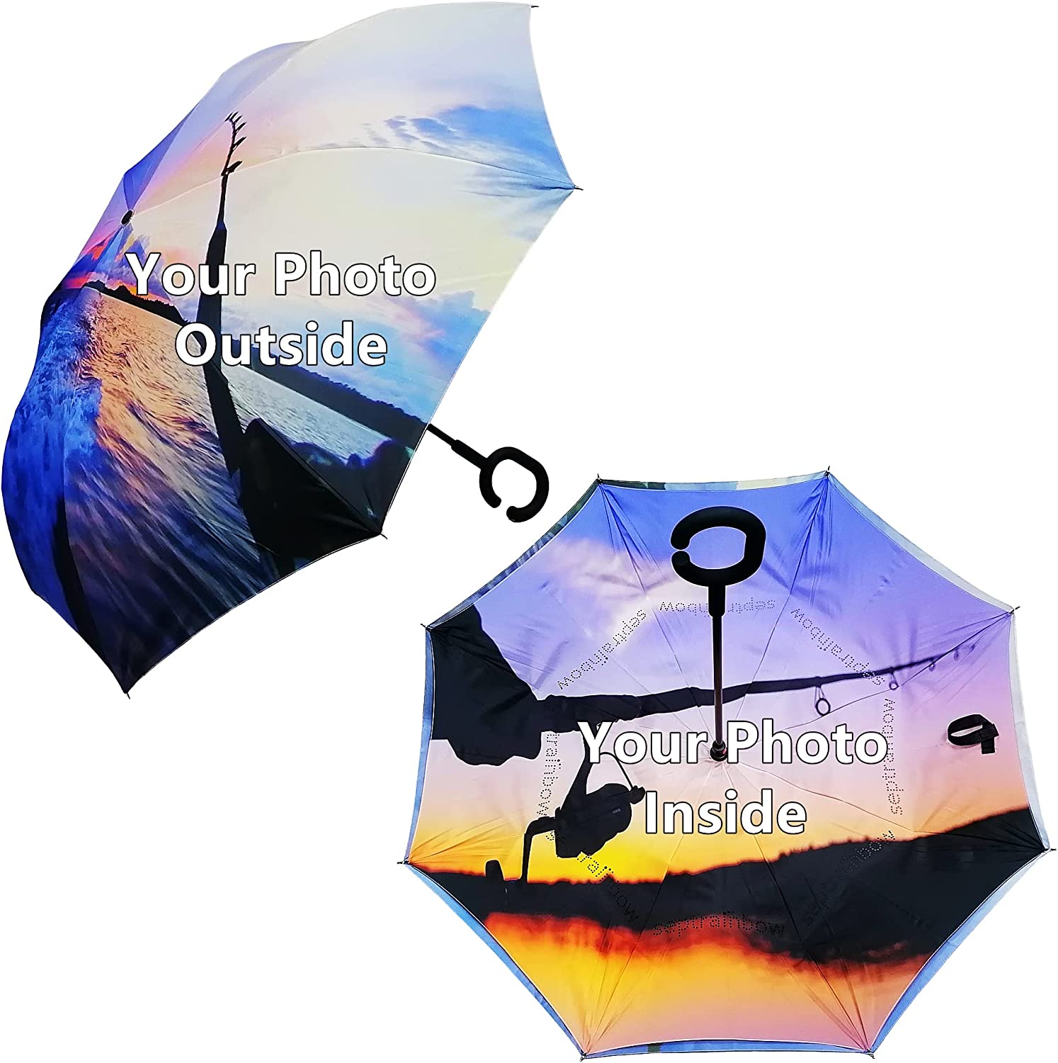 This is an multipurpose reverse umbrella Your pictures logo pattern design name or text designs and so on can be all over printed on the canopy it’s the veritable customized umbrella; In addition to unique customizable printing it also has a variety of useful functions: Special reverse opening and closing for car Self-standing indoor Hands free c-shaped handle Waterproof & UV protection Large size with double layer cover Windproof Portable and Durable etc.