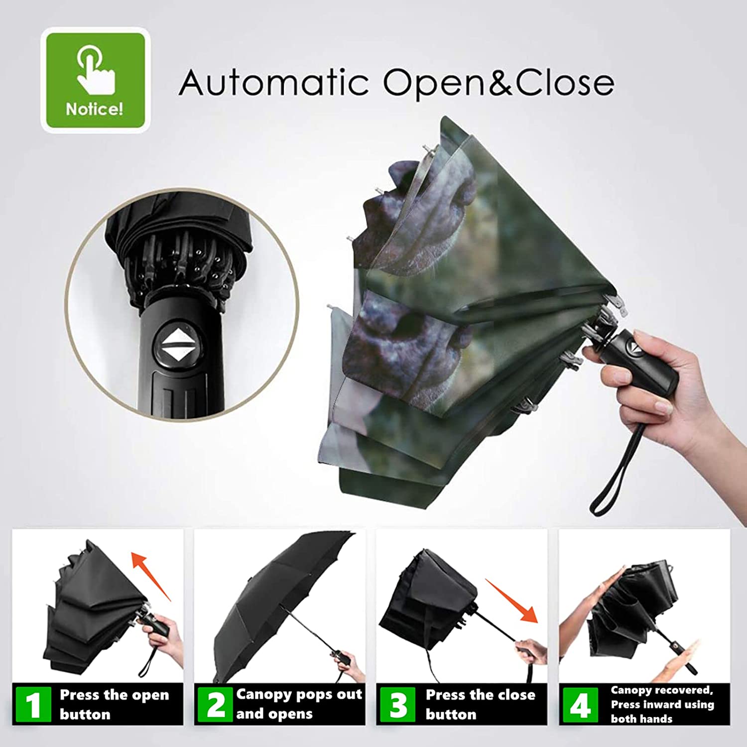 The comfortable frosted grip handle with a portable wrist strap A push button with up and down arrows provide this compact travel umbrella efficient auto-opening and auto-closing.