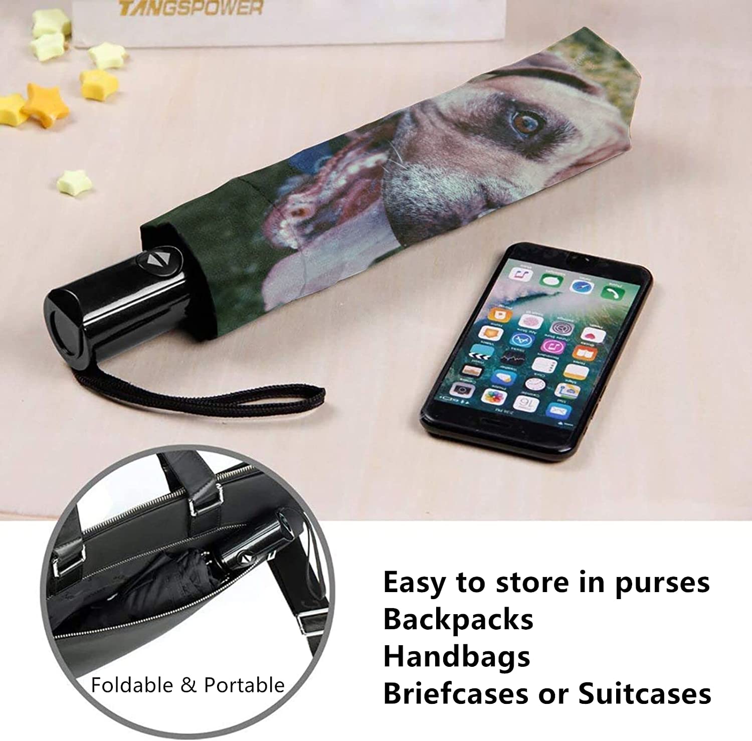 SMALL UMBRELLA: This automatic open close umbrella with 3 fold collapsible design the storage length is less than 11 inches the net weight only 350 grams fit easily in purse backpack handbag or briefcase.