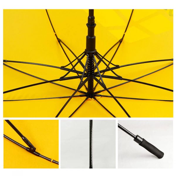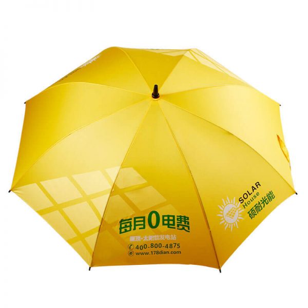 Custom Design Yellow Umbrellas with Branded Logo. The Frame and Handle Also Can Custom Yellow Colour. Yellow Fabric Colour, Fiberglass Frame Material.